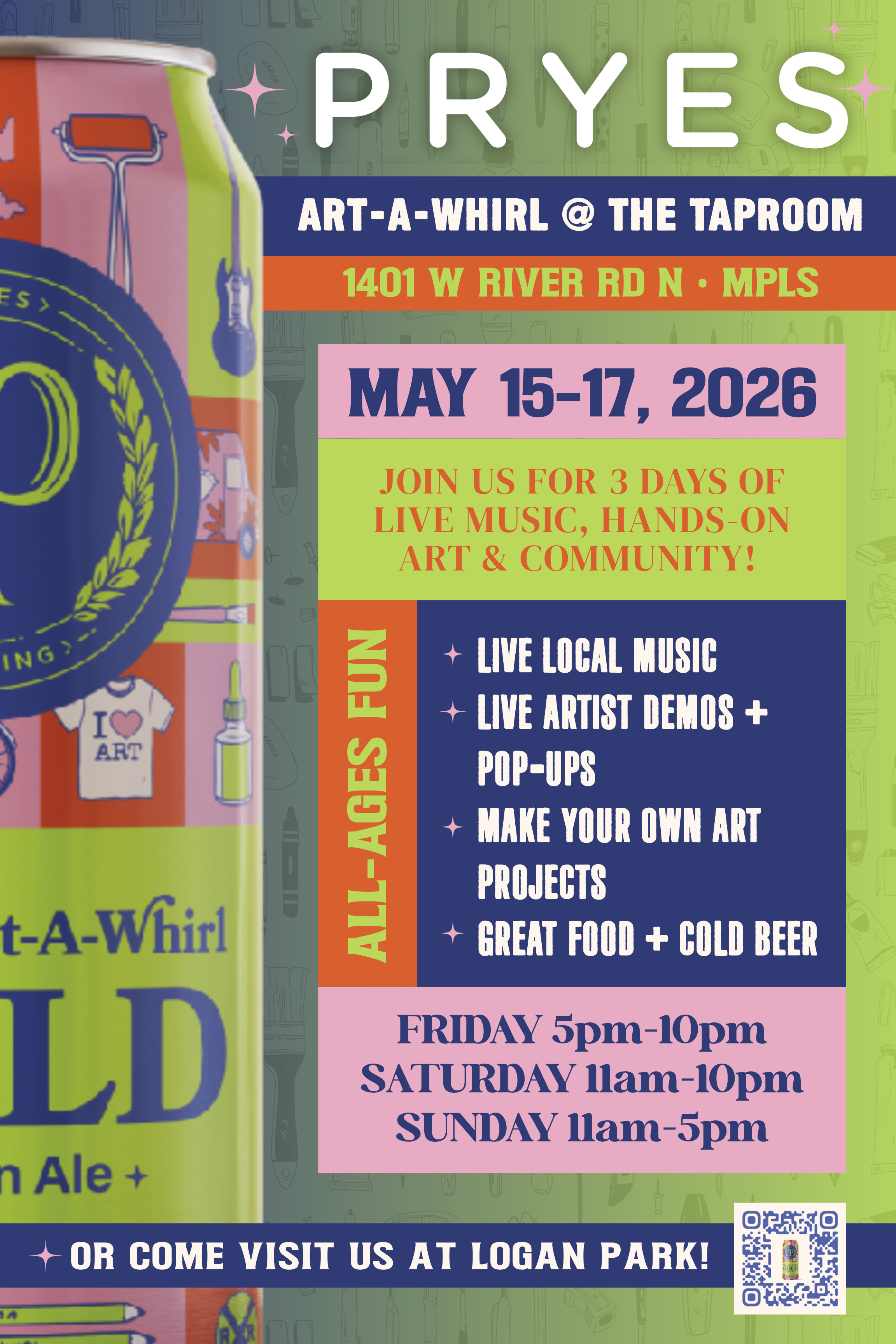 Taking place Friday, May 15 through Sunday, May 17, Pryes will transform its brewery at 1401 W River Rd N in Minneapolis into a hub of art, music, and community—inviting guests to experience Art-A-Whirl beyond the studio walls.